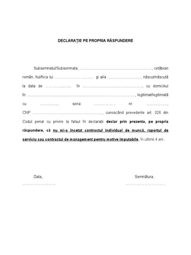 Declaratie De Proprie Raspundere ~ Declaratie cazier. Localitatile intrate in carantina unde e nevoie de declaratie pe propria raspundere sunt: Modelul declaraţiei pe proprie răspundere a fost actualizat, a anunţat, joi, grupul de comunicare strategică. 352 din codul penal al republicii moldova, că nu am antecedente penale și că nu mă aflu sub urmărire penală. O declaratie pe propria raspundere devine obligatorie. Declar pe propria răspundere, cunoscînd prevederile art.